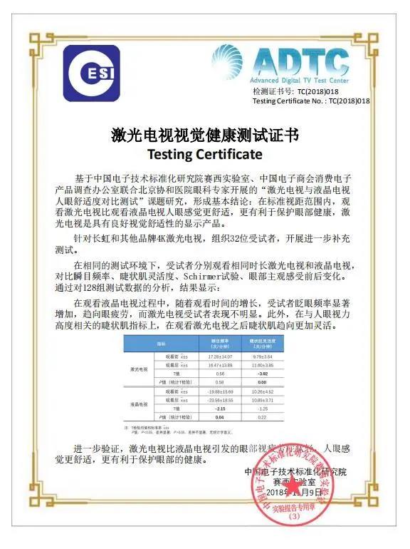 獲得中國電子技術標準化研究院賽西實驗室“激光電視視覺健康測試證書”,通過實驗證明激光電視相比液晶電視,更有利于保護觀看者眼部的健康,人眼觀看感覺更加舒適。