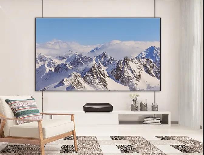 華錄4K激光電視天鵝M系列可投射80-100”大畫面,并根據客廳空間大小定制屏幕,靈活拆卸、方便安裝。