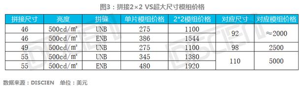目前拼接市場仍主要以模組形式出貨,從自身2×2模組價格及對應尺寸模組價格來看,無論選擇UNB還是ENB,2×2拼接模組價格均便宜對應超大尺寸產品模組價格。