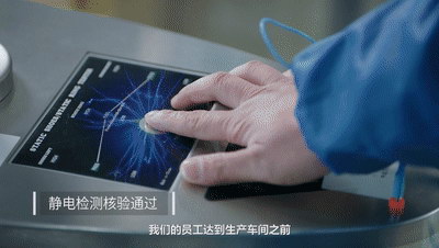 ↑ 員工進入生產車間之前,都要進行嚴格的靜電檢測,以及穿戴標準檢測。