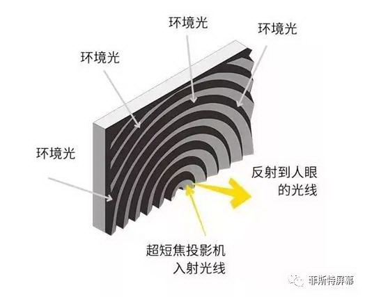 超短焦激光電視產(chǎn)品搭配光學(xué)屏幕,首推菲涅爾型光學(xué)屏幕,這種光學(xué)屏幕利用菲涅爾光學(xué)結(jié)構(gòu)原理能夠有效抵抗室內(nèi)環(huán)境光以及窗戶環(huán)境光對畫面造成的黯淡,有效將投影機(jī)的亮度均勻分布在屏幕正面,從而使觀看者獲得最佳對比度的圖像。