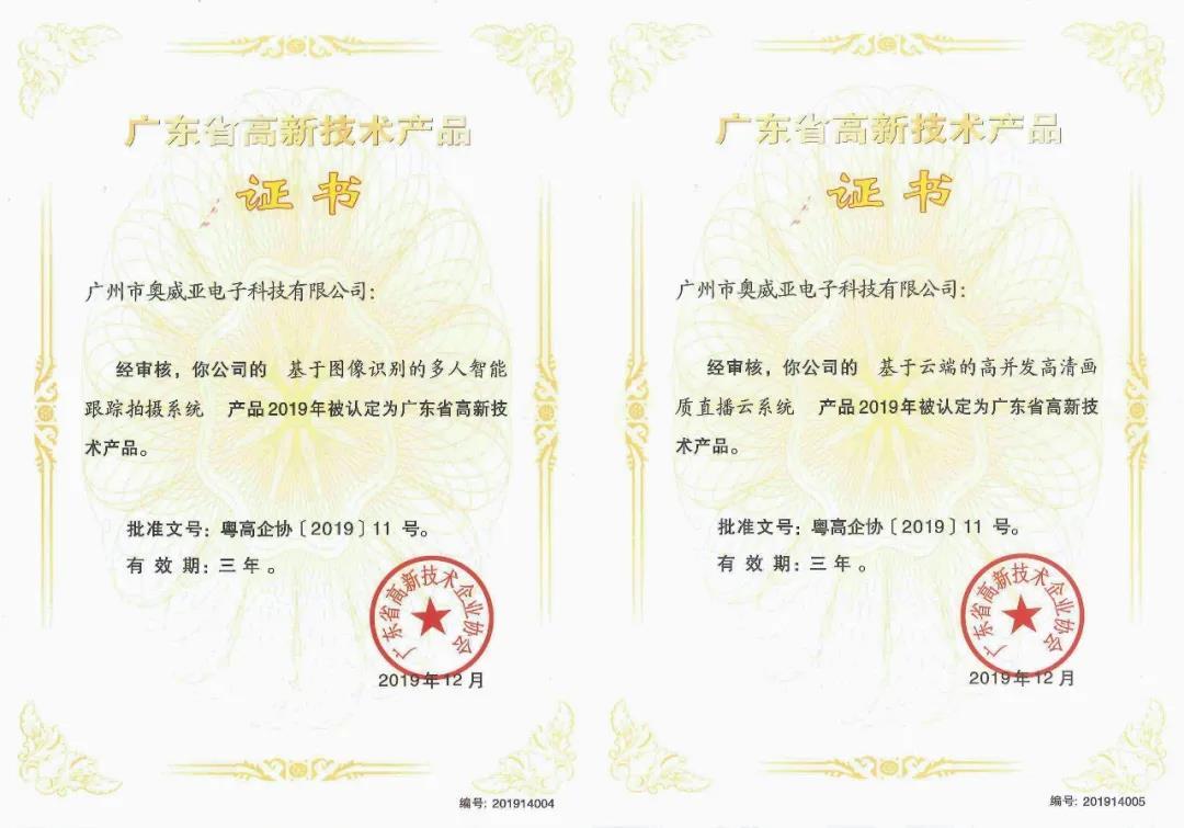 去年,奧威亞“基于圖像識別的多人智能跟蹤拍攝系統”和“基于云端的高并發高清畫質直播云系統”產品,又被認定為廣東省高新技術產品。