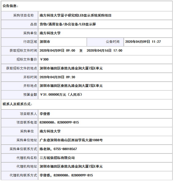 南方科技大學量子研究院LED顯示系統采購項目公開招標公告