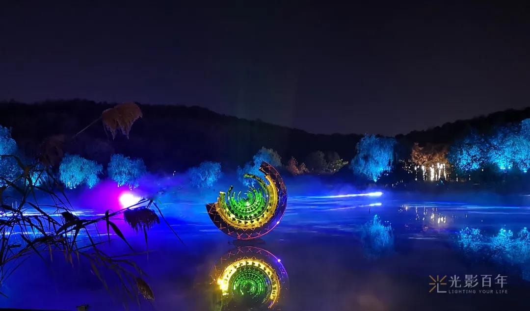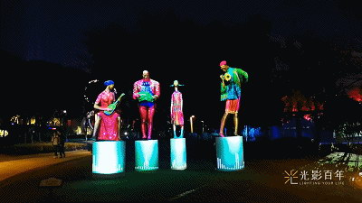 隨著夜幕降臨,這些造型各異的雕塑作品在燈光的映射下,以光影為裳款款步入我們視線。夢幻的林間3D亮化,營造出科技與藝術結合的視覺效果。