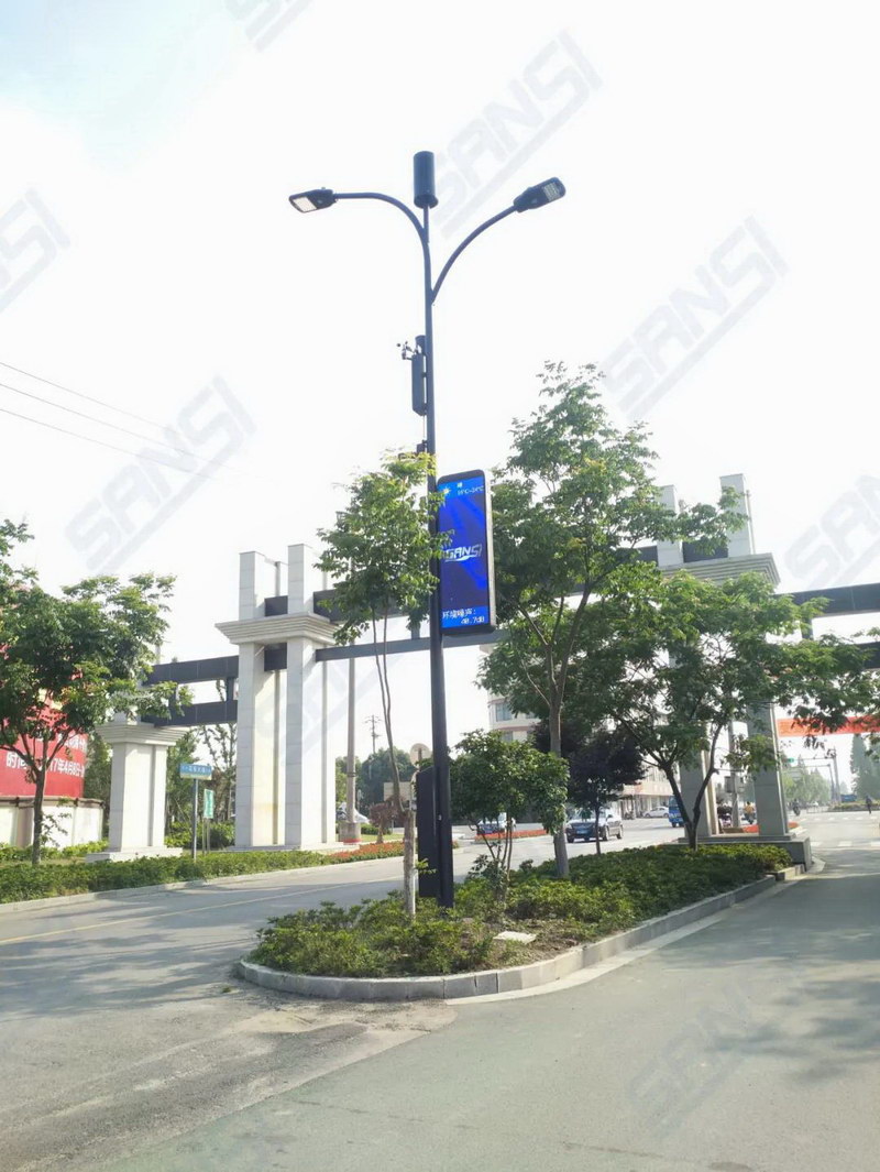 三思LED智慧路燈系統實時對當天氣溫、濕度、風向等天氣數據進行監控,在路燈LED顯示屏上一目了然。