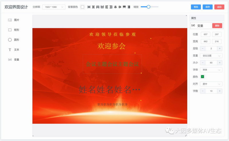 系統內嵌有功能強大的可視化圖形設計器,支持電子桌牌、歡迎界面、電子標語、會議室布局、會議信息發布等界面進行可視化布局設計、會議信息動態綁定、設計效果預覽等功能。