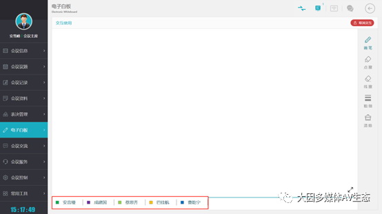系統支持個人和交互兩種電子白板應用模式,具有創建多頁面白板書寫功能,每個頁面支持刪除和自動保存,交互模式下可自動分配每個人的畫筆顏色,支持電子白板內容一鍵上屏。