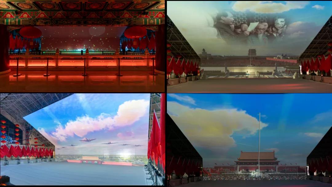 不過要說結(jié)構(gòu)投影,還是“開國大典·敢叫日月?lián)Q新天”這一幕最讓人震撼。整個(gè)展區(qū)通過大型L幕、結(jié)構(gòu)投影的方式,讓觀眾們親自“登上天安門城樓”,就座觀禮臺(tái),置身于“開國大典”的歡樂喜慶之中,仿佛被被帶到了那個(gè)“熱血沸騰”、“群情激昂”偉大時(shí)刻。