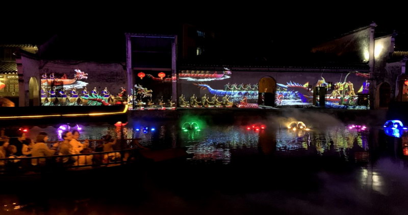 多媒體表演的主要亮點之一是在著名的百間樓墻體上進行的令人驚嘆的數字投影。一組科視Christie GS 系列投影機(包括 DWU850-GS 和 DWU1075-GS)匠心獨具地安裝在水道的對岸,進行明亮而逼真的視覺展示。其中包括描繪本地人日常生活、龍舟比賽和傳統婚禮的圖像。游客們可以坐著小船沿水道慢慢前行,細細欣賞這些精彩投影。