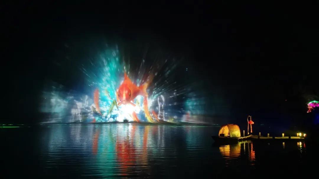 就在觀眾不經意時,一條火紅的錦鯉躍然而出,又猛地扎進湖面,畫面栩栩如生,十分連貫。