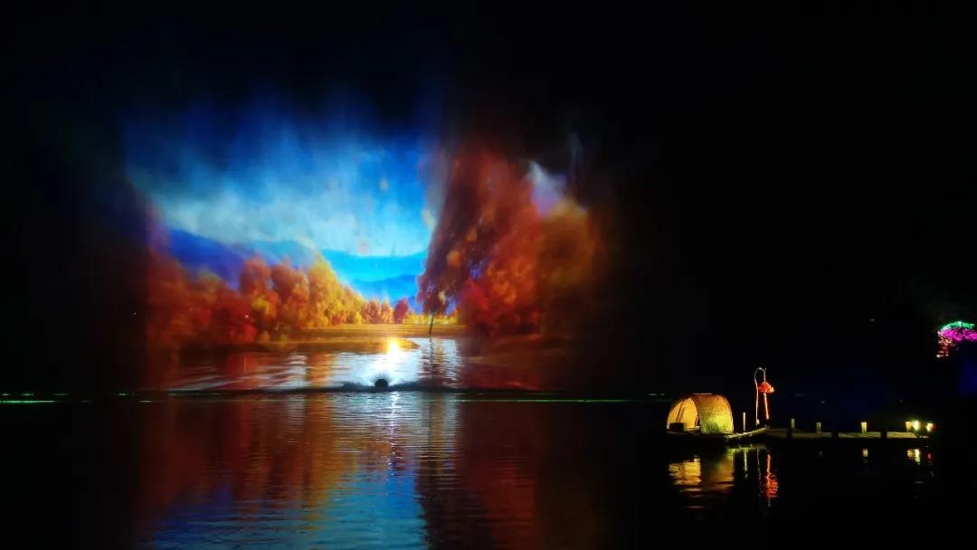 拈花塔利用光影打造了一個禪意空間,拈花湖上也在上演著一幕東方禪意畫卷。由兩臺16,000流明的松下液晶激光系列工程投影機PT-SMZ16KCL,打造的寬22米、高13米的水幕投影,也是這里的代表性項目之一。