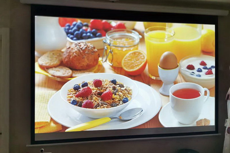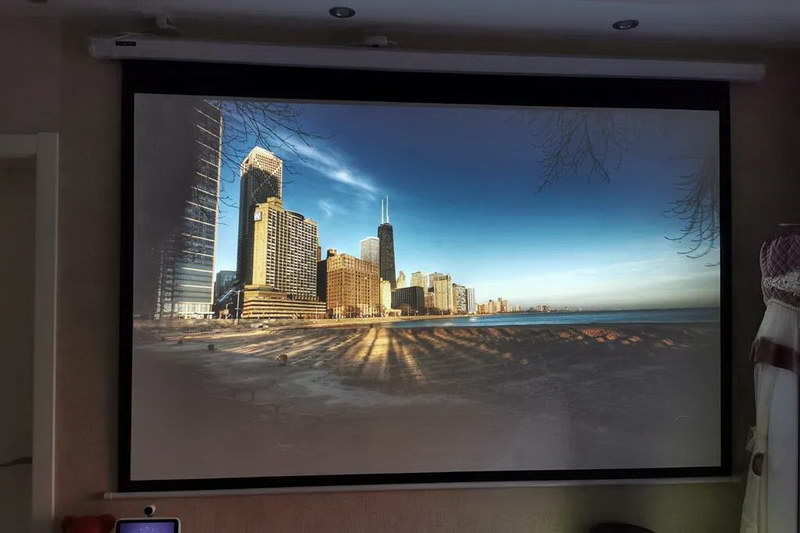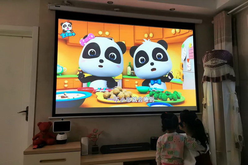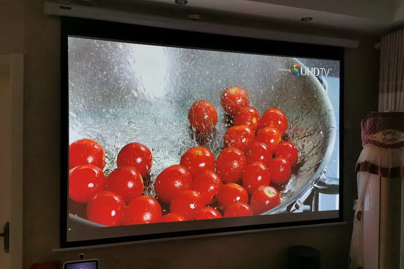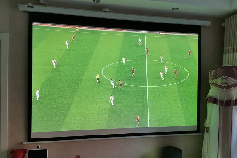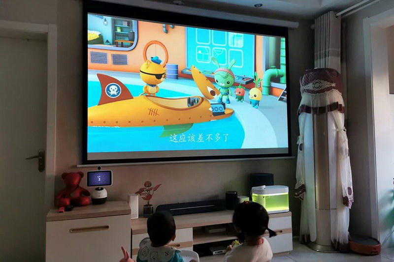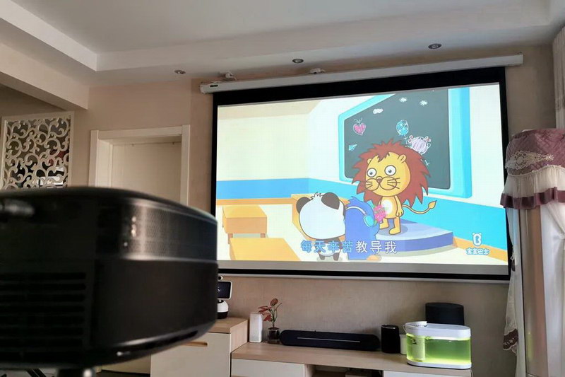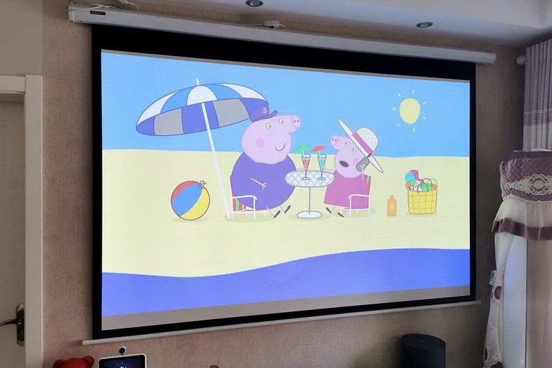我家的客廳寬度不到3米,幕布是100吋的,為了給大家展示100吋的畫面大小,我特地用iPad來做個簡單對比。相比50吋的電視機而言,畫面被放大了4倍,觀看體驗加倍升級,幸福感油然而生。如果你家客廳墻壁夠大的話,可以嘗試120或者200吋的巨幕效果。