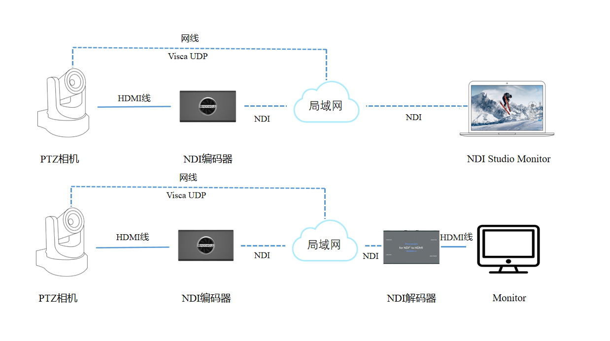 針對具有RJ45網口的PTZ相機,用戶可將攝像機連入美樂威NDI編碼器相同的局域網,并通過HDMI線連接該編碼器。由NDI解碼端(可以是支持NDI解碼且整合了NDI PTZ SDK的軟件,如NDI studio monitor或者是美樂威NDI解碼器)發送過來的PTZ指令會被美樂威NDI編碼器轉換后以Visca UDP協議發給PTZ相機,進而控制PTZ相機。具體設備連接方案如下圖: