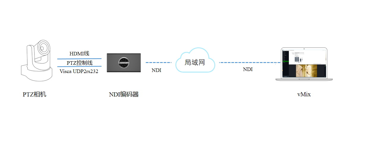 此外,有一些軟件雖然支持NDI的解碼,但沒有整合NDI PTZ控制的功能,如vMix軟件。這類用戶可以使用美樂威NDI編碼器即將發布的固件中支持的Visca UDP2rs232協議來實現對應對云臺的控制。其設備連接和控制邏輯與使用Visca/PELCO-D/PELCO-P協議相似,具體設備連接方案如下圖所示。