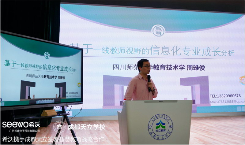 同時(shí),為讓老師們更深入了解教育信息化,在此次簽約儀式上,四川師范大學(xué)周雄俊教授做了《基于一線教師事業(yè)的信息化專業(yè)成長(zhǎng)分析》主題講座,為老師們提供了信息化專業(yè)成長(zhǎng)方向指引。
