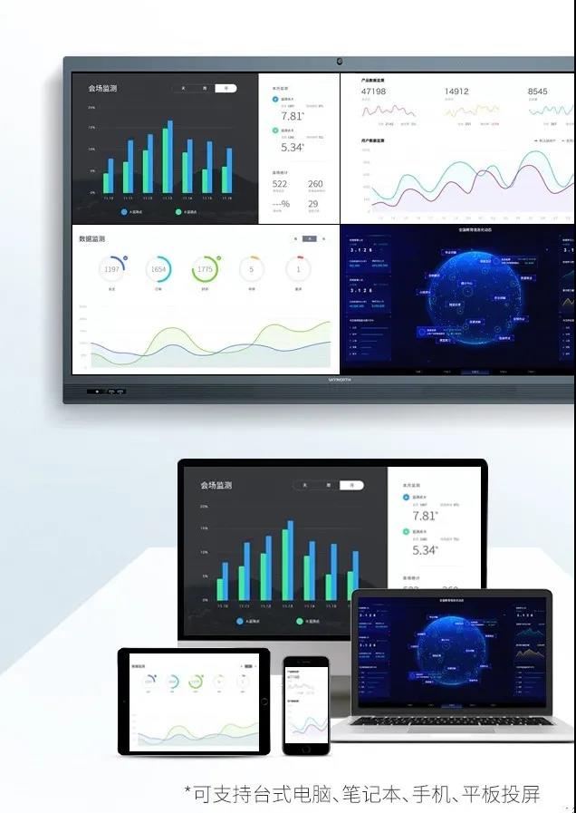 支持電腦、平板、手機多端連接,通過無線投屏器或投屏軟件一鍵投屏,支持4臺設備同時投屏顯示,演講者可獨立控制每個分屏的聲音、位置、大小,電腦投屏后可在大屏上實現對電腦文件的反控。雙屏WIFi,低延遲,不卡頓,還支持任意通道隨心批注,支持多筆多色,讓思考與行動同步。