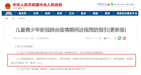 國家衛(wèi)生健康委發(fā)布的《指引》顯示“使用投影儀時(shí),觀看距離應(yīng)在3米以上;使用電視時(shí),觀看距離應(yīng)在屏幕對(duì)角線距離的4倍以上;使用電腦時(shí),觀看距離應(yīng)在50厘米(約一臂長)以上。”