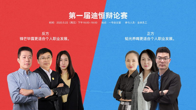 中國傳統文化大多貶低鋒芒畢露,崇尚韜光養晦。卻不知,鋒芒畢露和韜光養晦本是相互相生,鋒芒露完了自然就低調開始積蓄能量,韜光養了一段時日自然又需要露一手。針對在當下,對于在職場中如何發展最為廣泛流傳的兩種觀點,迪恒開展了以“鋒芒畢露/韜光養晦更適合職業發展”為題的辯論賽。