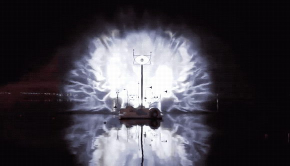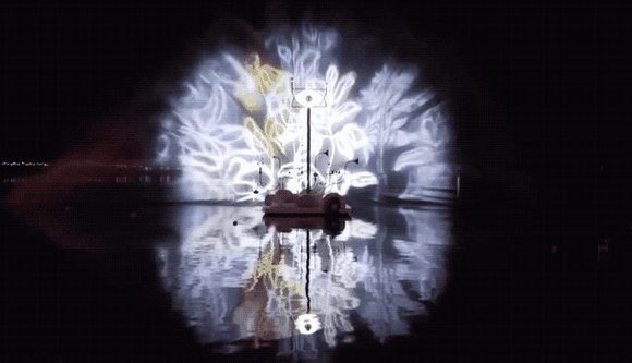 人們越是向湖岸邊潛望鏡似的裝置里大喊,湖面上的迷幻動畫就越是明艷多彩;人們跳舞和喊叫的次數越多,他們越能直接影響節日上的動畫和視頻。仔細看,你會發現驚喜不僅是毫無意義的圖案、形狀孤立的展示,更重要的是,它還可以通過水幕的形式,給你娓娓道來一個生動的故事,讓人更加無法錯過,戲劇性也凸顯得十分明顯。除了動作還有聲音,對著裝置上的“喇叭”吶喊,水幕也會隨著聲音而改變,給予了觀眾全方位的感官體驗,“體驗與分享”是這個show的精神所在。