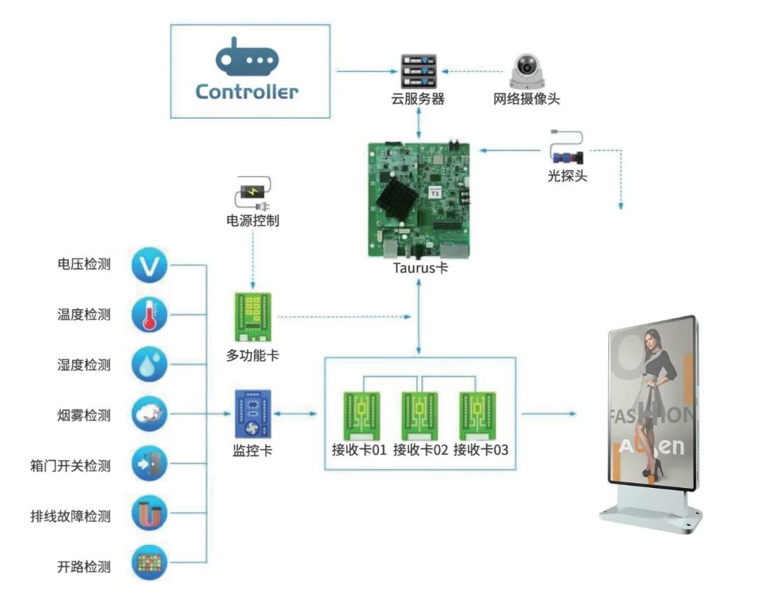 用戶能夠監(jiān)控屏體的發(fā)送卡、DVI、網(wǎng)絡(luò)狀態(tài)、溫度、接收卡電壓、監(jiān)控卡的排線、濕度、煙霧、箱門開關(guān)、風(fēng)扇轉(zhuǎn)速、8 路電源電壓、箱體溫度。同時可以設(shè)置溫度告警閾值,對屏體亮度進(jìn)行調(diào)節(jié)。