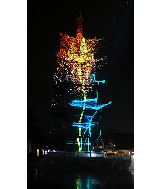 由13臺31,000流明的松下工程投影機PT-SRZ31KC打造的一場光影盛宴,讓拈花塔的整個塔身熠熠生輝!