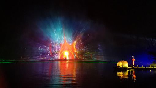 拈花塔利用光影打造了一個禪意空間,拈花湖上也在上演著一幕東方禪意畫卷。由兩臺16,000流明的松下液晶激光系列工程投影機PT-SMZ16KCL,打造的寬22米、高13米的水幕投影,也是這里的代表性項目之一。