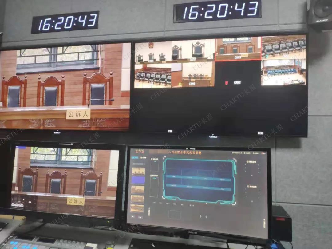 CHARTU長圖運用8K分布式高清輸入輸出節點、云平臺、系統編程軟件等實現法庭與會議室,會議室與會議室之間互聯互通。