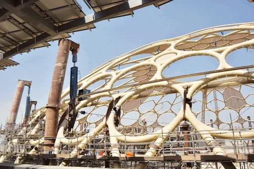 Al Wasl Dome是一個(gè)開放性的半球形建筑,一個(gè)大跨度的殼結(jié)構(gòu),跨越130米的中央廣場區(qū)域,并上升到67米的高度。它由S460級(jí)管道組成,形成相互連接的環(huán),產(chǎn)生外殼的圖案。有效融合了驚人的設(shè)計(jì),創(chuàng)新技術(shù)和伊斯蘭文明中獨(dú)特的建筑風(fēng)格。