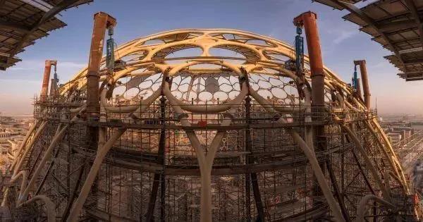 2018年6月,圓頂鋼結(jié)構(gòu)的最后一部分離開了意大利,為圓頂?shù)募用醿x式做了準(zhǔn)備。單個(gè)元素在一個(gè)月后抵達(dá)迪拜,預(yù)制冠的組裝可以在地面開始,然后通過鋼絞線提升到位。
