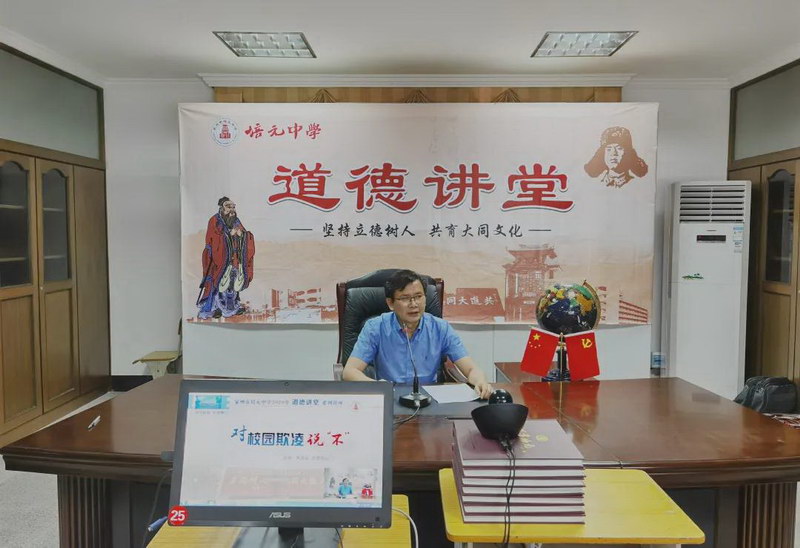5月27日下午,培元中學道德講堂開講“對校園欺凌說不”,這是學校2020年春季復課以來開設的第一期道德講堂,講座采用校電視臺視頻直播的方式,面向全校學生和班主任,校黨委書記郭國金主講,政教處副主任江小飛負責主持。