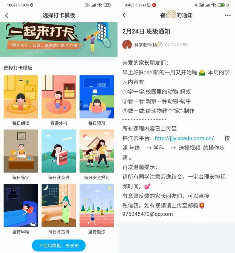 錦江e教支持教師線上發(fā)起打卡、發(fā)布通知等