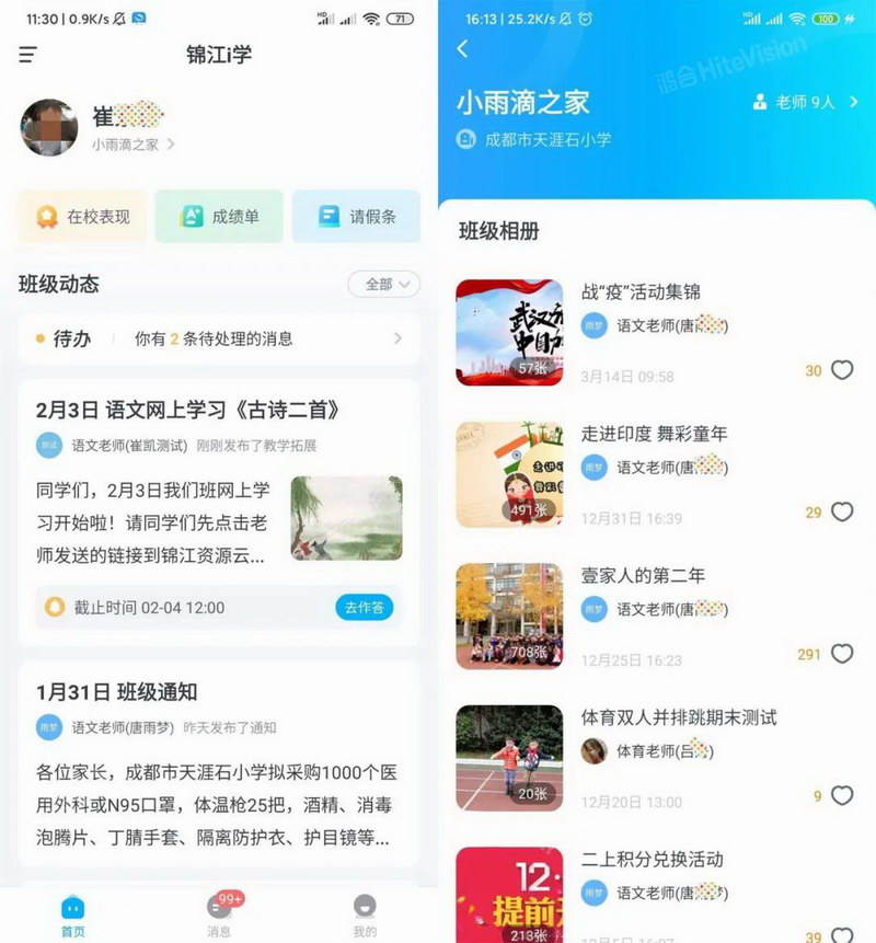 學生和家長通過錦江i學隨時查看班級動態(tài)、班級相冊