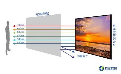 健康護(hù)眼。波長處于400nm-450nm之間的短波藍(lán)光具有極高能量,能夠穿透晶狀體直達(dá)視網(wǎng)膜,使眼睛內(nèi)的黃斑區(qū)毒素量增高,并導(dǎo)致光敏感細(xì)胞缺少養(yǎng)分從而引起視力損傷,而且這些損傷是不可逆的,會嚴(yán)重威脅觀看者的眼底健康。微陣列背投產(chǎn)品投影面的光學(xué)膜設(shè)計(jì)是勝龍股份匠心所在,勝龍研發(fā)團(tuán)隊(duì)投入大量研發(fā)經(jīng)費(fèi),歷時多年成功在光學(xué)設(shè)計(jì)中增加了抗藍(lán)光因子和漫反射層,最大程度改變了有害藍(lán)光和眩光的視力損害,有效保護(hù)觀看者視力。