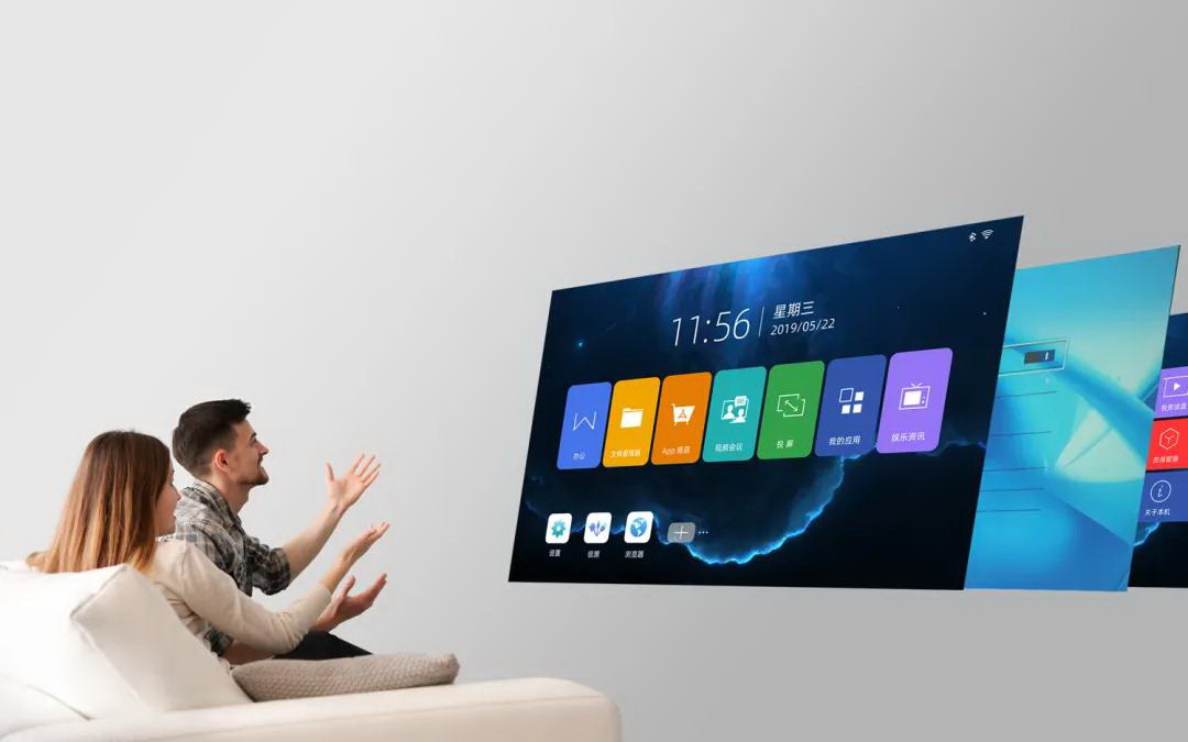 智能A3系列產品的All in one智能系統是基于7.0系統定制開發,反應迅捷流暢,操控更輕松,安卓系統開源式系統,擁有龐大而成熟的APP,海量的內容資源,用戶可通過手機、平板電腦等設備,進行觀影、演示分享、健身Keep……。