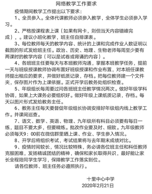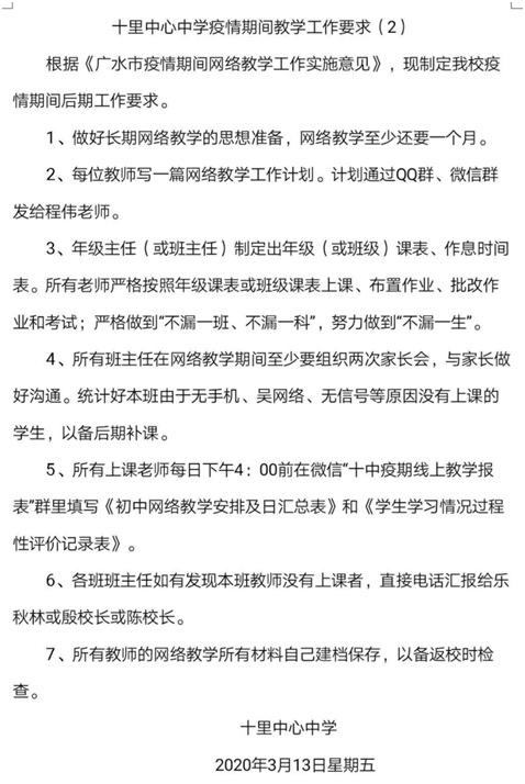 廣水市十里街道辦事處中心中學(xué)在校長陳江濤的總體部署下,通過對教師、家長、學(xué)生調(diào)研,積極解決網(wǎng)絡(luò)教學(xué)存在的硬軟件問題,制定健全的線上教學(xué)方案,穩(wěn)定推動網(wǎng)絡(luò)教學(xué)的進(jìn)行。