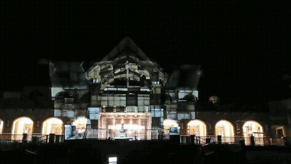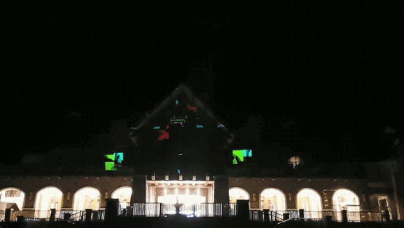 這場光影秀由安恒集團提供解決方案,利用兩臺16,000流明的松下液晶激光工程投影機PT-SMZ16KCL采用豎向融合的方式進行投影,總投影面積約233平方米,屏前照度高達(dá)113lux。