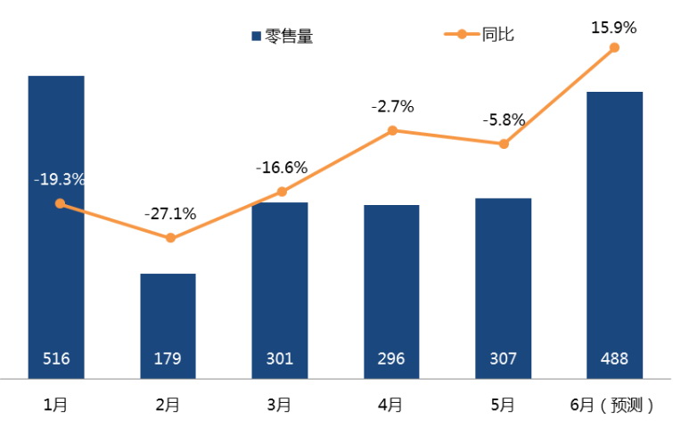 2020年1-6月中國彩電市場規模及同比變化
