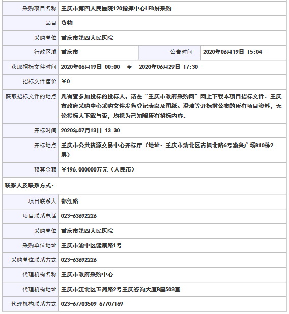 重慶市第四人民醫(yī)院120指揮中心LED屏采購(gòu)(20A00291)采購(gòu)公告