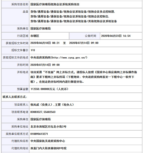 采購項目名稱: 國家醫療保障局視頻會議系統采購項目