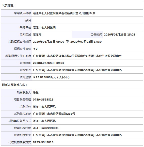 湛江中心人民醫院視頻會議系統設備公開招標公告