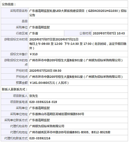 采購項目名稱: 廣東省高明監獄禮堂LED大屏系統建設項目 (GZSW20201HG1038)招標公告