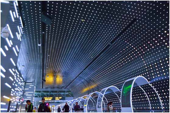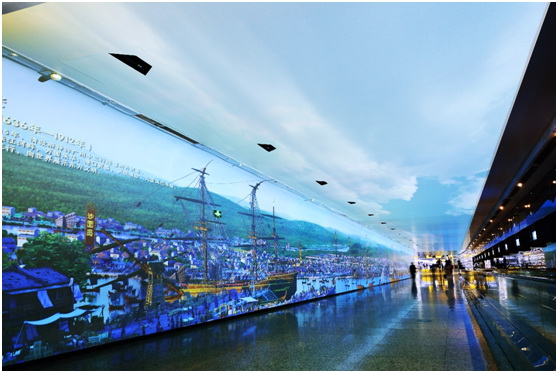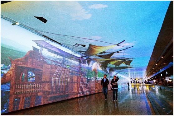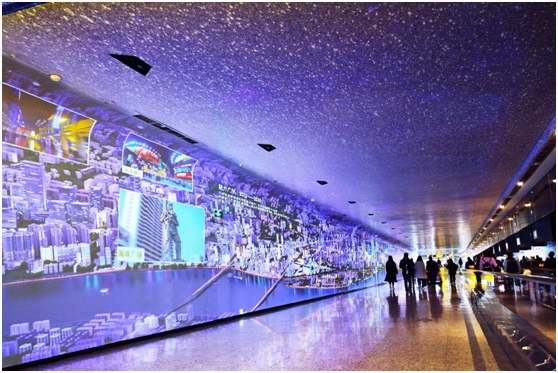人在旅途,機場中轉站成為旅客掃去一身疲憊的落腳點。為了提升旅客飛行前后體驗,廣州白云國際機場著力于借助高科技手段激活機場空間,打造了一條集公共服務、藝術展示、廣告發布于一體的“時空隧道”,這在全國機場尚屬首創。在全長約200余米,空間面積超過2500平方米的時空長廊中,總共采用54臺NEC激光投影機,帶來一場奇譎夢幻的穿越之旅。