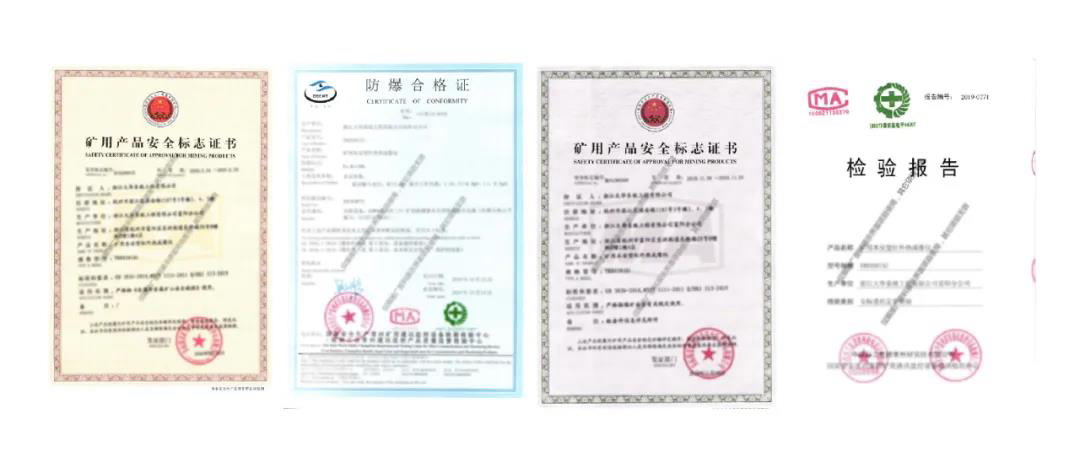 產(chǎn)品通過國家安全生產(chǎn)監(jiān)控設備檢測中心的安標委托定型檢驗,在正常工作中不會產(chǎn)生電火花、電弧及高溫,從而避免引爆易爆物質(zhì)。同時,具備滿足煤礦安全有關規(guī)定和非煤礦山安全規(guī)程要求的兩項礦用產(chǎn)品安全標志證書。