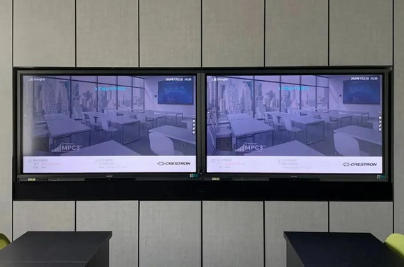 儀式結束后,受邀嘉賓們分組參觀了嶄新的辦公室。前臺映入眼簾的是一塊newline智能交互平板,作為導覽及互動使用。此屏可以和快思聰中控及預約平臺對接,實時顯示整個樓層各個會議室的狀態,以及會議室主要功能,如:普通會議室,音頻、視頻會議室等。