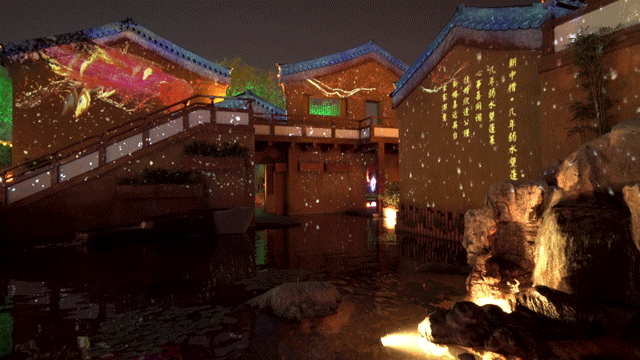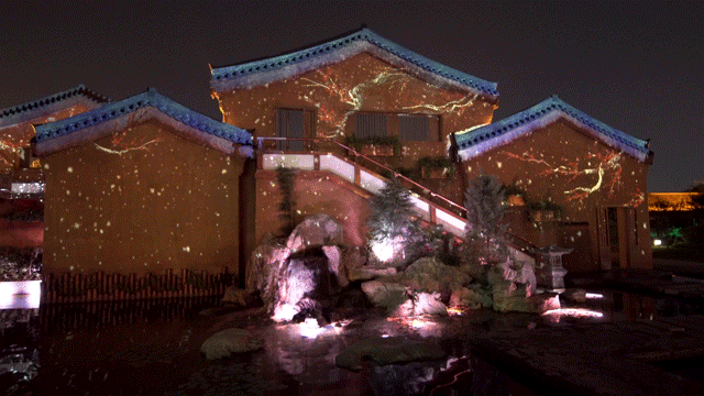 本次園區夜游升級,《禧墻》區域采用11臺Vivitek(麗訊) RU75953激光投影機打造而成,巧妙地利用原始建筑墻面,投射春夏秋冬四季不同景致。每當入夜,園內原本簡約古樸的仿宋建筑,在假山、水系、植物的映襯下,瞬間打造成一座360°開放式古典實景劇場。