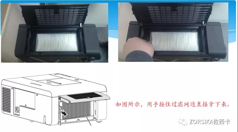 當(dāng)顯示更換信息過濾網(wǎng)指示燈“FILTER”因堵塞報(bào)警時(shí),表示過濾網(wǎng)堵塞需要清洗或者更換過濾網(wǎng)。(表現(xiàn)為投影機(jī)電源關(guān)閉,F(xiàn)ILTER指示燈閃爍和待機(jī)指示燈ON(G)STANDBY亮起)。