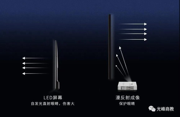 小屏幕教學時,為了看清畫面,觀看距離近,且需要保持長久的盯住固定畫面,長此以往視力嚴重下降。光峰激光投影畫面覆蓋60-300吋畫面,在教室應用中,盡可能保持畫面最大化,需要長距離觀看,且觀看大屏幕時,眼球可以保持靈活的轉動,找準舒適清晰的觀看姿態,避免視覺疲勞,降低視力下降的危險。
