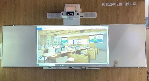 傳統教學模式中的“粉筆+黑板”組合看起來似乎已有些過時,愛普生與合作伙伴一起,推出了更智慧化的助教無塵白板方案。投影機將課件畫面投射在白板上,老師可以對課件內容進行圈點批注、擦擦寫寫,存在云端的筆記和資源也可以同步進行投影。兩側白板上的書寫內容亦可通過投影機同步顯示在投影畫面中。