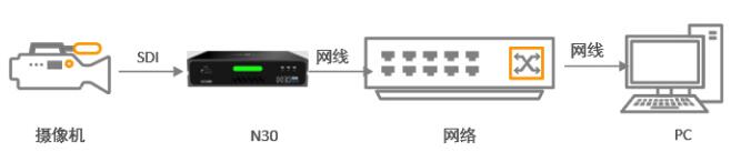 1、攝像機通過SDI/HDMI線連接到千視NDI編碼器(以N30為例),將N30連接到網(wǎng)絡(luò)交換機,同時電腦也連接到相同的子網(wǎng),當(dāng)網(wǎng)絡(luò)具有DHCP功能的時候,N30設(shè)備將自動獲取IP,在同一子網(wǎng)下,N30編碼后的NDI流,可以被其他NDI設(shè)備發(fā)現(xiàn)。具體設(shè)備連接如下圖所示: