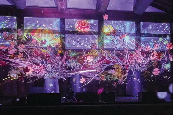 利用全息投影幕布將數(shù)字影像展現(xiàn)的鳳凰與真實的插花融為一體。